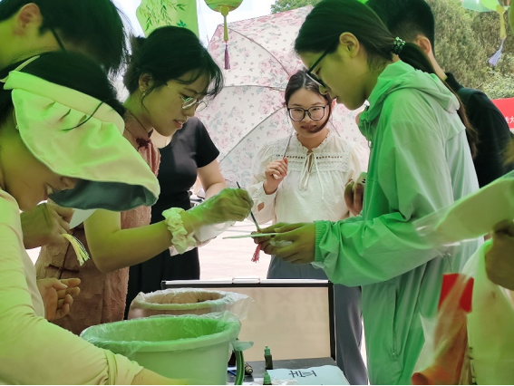 “承文化·跃青春”采取线下活动的方式,鼓励同学们体会中华传统文化、分享人生体会、推荐精品书目、探讨学术前沿,帮助广大研究生学习到更多精彩纷呈的学术知识,同时从传统文化中汲取养分,更好地践行社会主义核心价值观。参与者在现场领取10支箭,在距离壶1.5米处进行投掷,投进4只箭即可以制作书签、投进6支箭即可制作漆扇。此外,在手绘团扇和非遗漆扇活动中,参与者于现场完成团扇的绘制,并在工作群里进行返图,即可参与漆扇的制作。活动现场吸引了众多同学参与,特别是漆扇活动深受同学们的喜爱,大家纷纷动手实践,调制漆液、配色构图、滴漆成形,每一个环节都考验着参与者的耐心与技艺,现场气氛热烈而和谐。