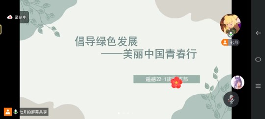 遥感科学与技术22-1班团支部在6月9日19:30于线上开展“倡导绿色发展,美丽中国青春行”主题团日活动。此次活动由团支书张月琪组织,组织委员刘昌泰宇、宣传委员刘娜协助完成,全班同学参会。