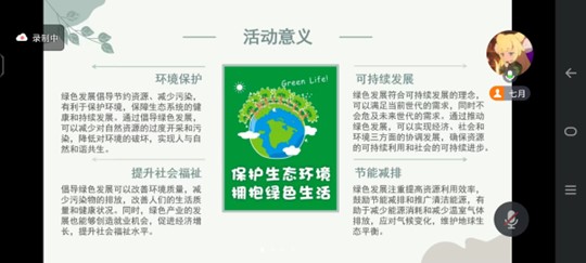 首先张月琪给大家播放了保护环境相关视频介绍了中国保护环境绿色发展的背景。然后给大家分享了一首关于环境保护的歌曲《一路前行》,说明了环境保护的重要性以及意义。最后呼吁大家积极行动起来,从身边小事做起,例如通过参加植树造林活动、减少塑料使用、进行垃圾分类、节约能源低碳出行等方式倡导绿色发展,建设美丽中国。