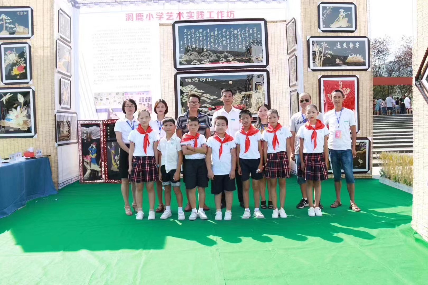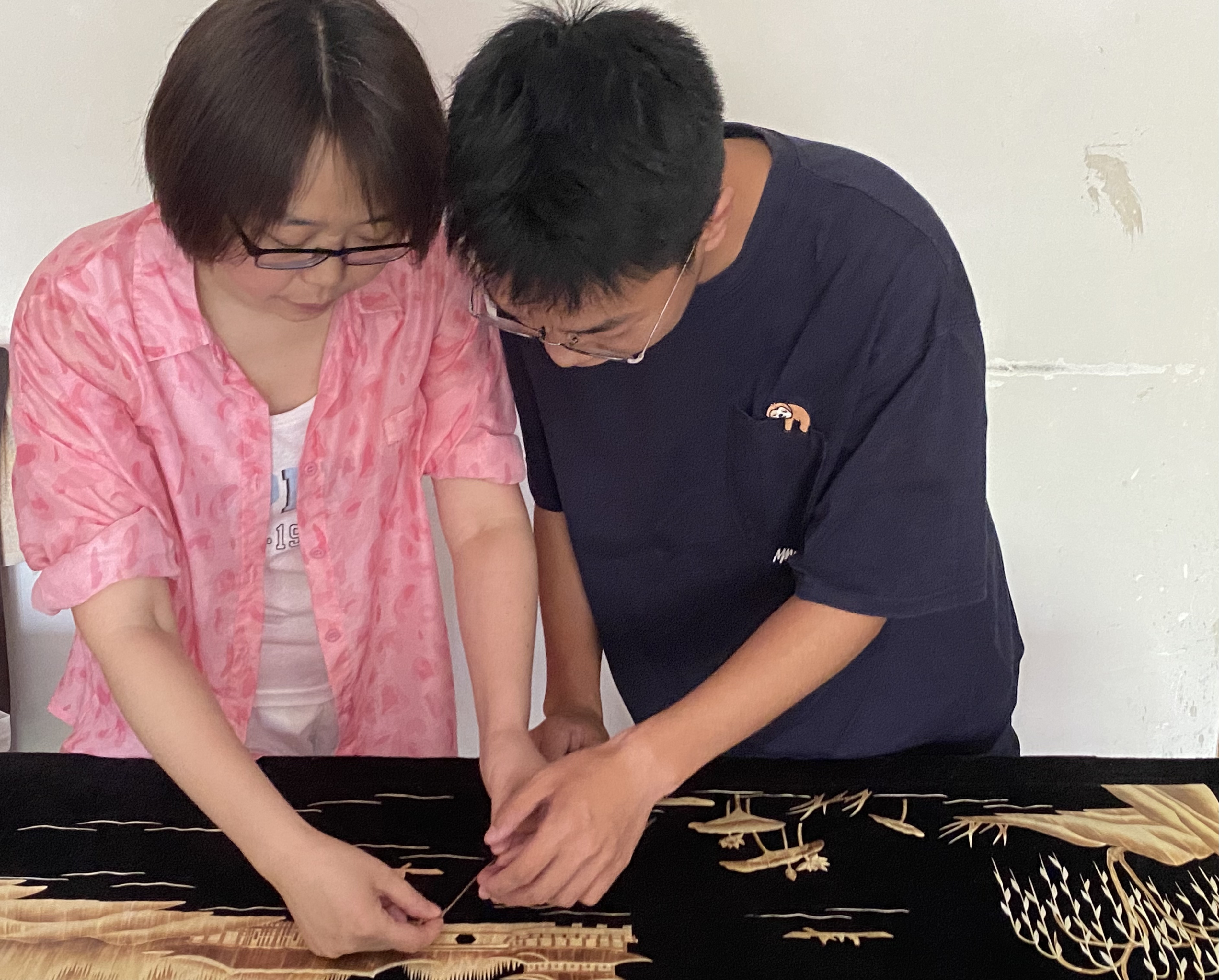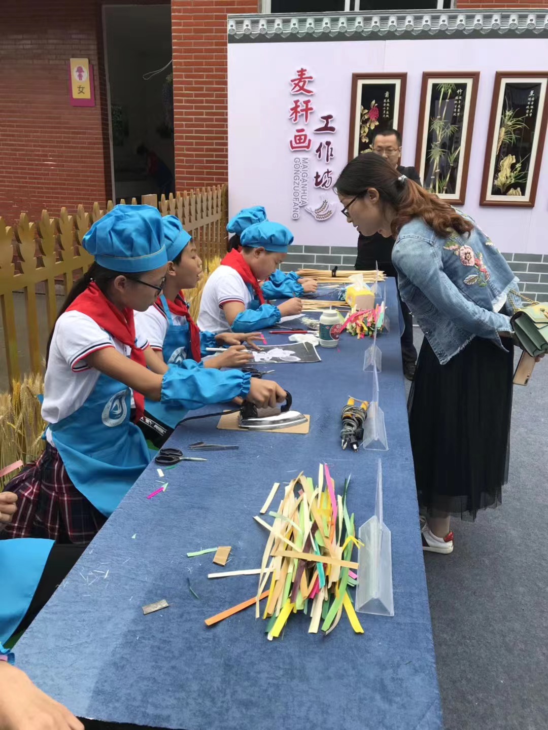据悉,该工作室于2017年末申报重庆市乡村少年宫项目,次年成为首批正式成立的艺术实践工作坊。汤老师是该工作坊教授麦秆画的老师之一,自工作坊成立至今,在她和同事的共同努力下,该校高年级学生都学会了麦秆画。一幅幅由学生完成的麦秆画被骄傲地挂在学校展览墙上,成了洞鹿小学的“金字招牌”。在该团队教师的带领下,周文皓了解到一幅麦秆画的制作工序其实很复杂,麦秆经过蒸、泡、刮等七道工序才能进行漂染、熨烫再到最后组成一幅完整的作品。一幅简单的作品学生当堂课就能完成,但大幅的复杂作品可能需要花费数月时间。