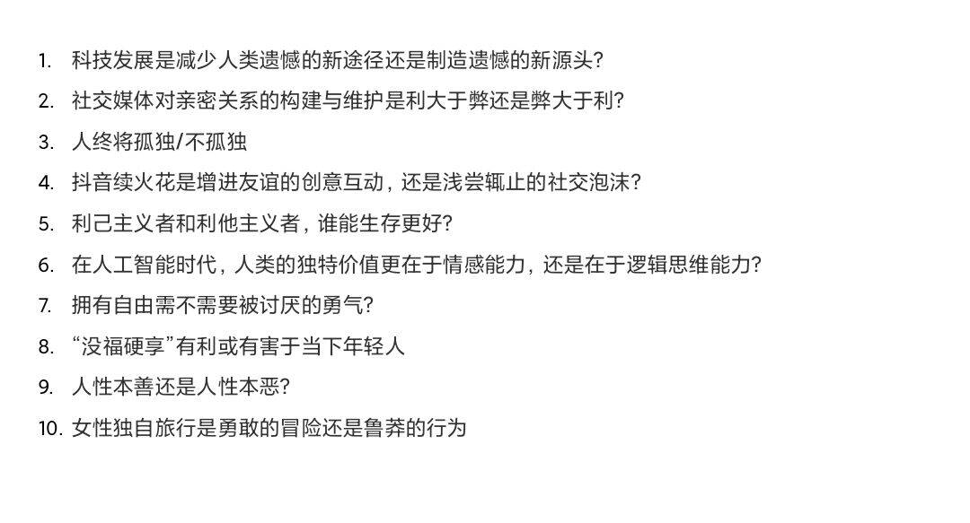 活动期间,同学们积极参与,通过所见所闻和互联网等方式想出辩题,辩题涵盖了教育、文化、环境等多个领域,体现了同学们观察力和思辨力。活动后期,评委对参与者的作品进行评选,并将其中优秀的辩题提交校会。