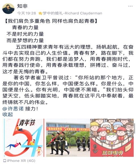 回首过去,以青年学生主导的五四运动已经过去101年了;展望未来,虽然时代在变化,但是五四精神却依然没有过时,激励着一代代青年,用青春和汗水,谱写着一段段华丽的人生乐章。在五四青年节到来之际,为响应院团委的号召,测绘19-8班举行了班级线上研讨会。