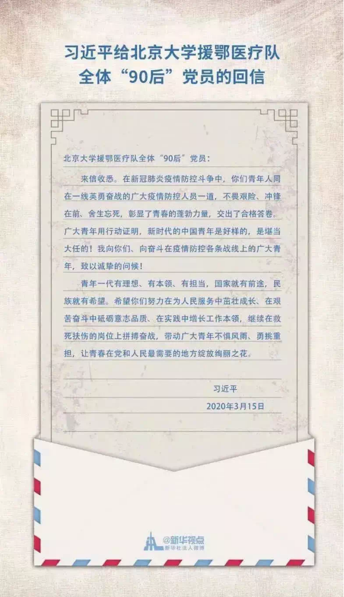 习近平给北京大学援鄂医疗队全体“90后”党员的回信