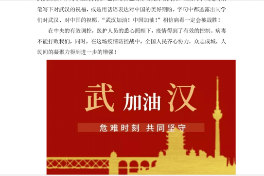 在中央的有效调控、医护人员的悉心照顾、全国人民的齐心帮助下,疫情得到了有效的控制。而作为学生的我们,首先要做好的就是保护好自己的健康。除此之外,在班长及团支书的带领下,同学们亦是用纸笔写下对武汉、对中国的美好祝福;亦或是用语音的形式,为武汉加油。