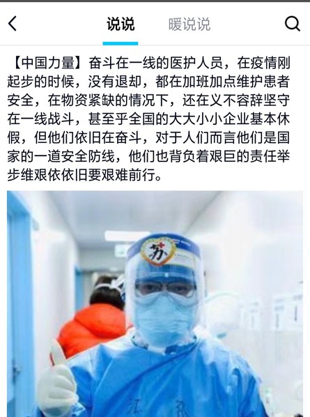 虽是在疫情期间,但同学们都积极参与了活动。有的同学用QQ分享了与疫情相关的视频并以文字的形式分享了自己的感受;有的同学以短视频的方式记录了一线医护人员的感动瞬间;还有部分同学制作了PPT,以此来加深我们对疫情的了解。面对疫情,我们虽无法像医护人员一样冲到前线,但我们却能够做到听从号召,科学防护,利用假期时间勤读书、勤思考,学习新知识新技能,全面提升自己。
