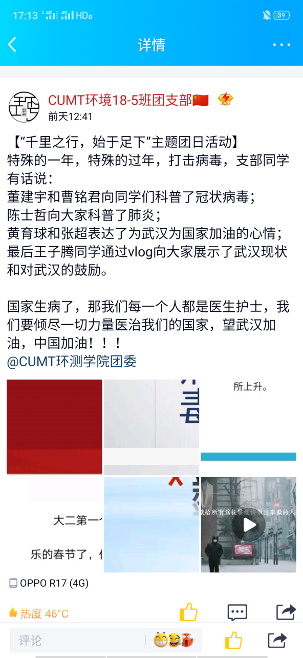 本次活动最大的特点是全程采用线上模式,前期通过团支书在班群里发布活动,并为同学们讲解本次活动的目的及意义,接着同学们积极响应,以饱满的热情投入到本次活动中来。考虑到线上宣传的局限性以及同学们的积极参与,在班长、团支书等班委商议后决定每天只需五到六位同学上交宣传材料。针对本次活动,同学们参与的方式丰富多彩,有介绍新型冠状病毒相关知识的,也有制作VLOG展示自己家乡为防控疫情做的各项工作,还有同学向大家展示了自己在家里面的读书感悟。这个假期注定是难以忘怀的,病毒虽然阻挡了我们外出的步伐,但挡不住大家学习的心。
