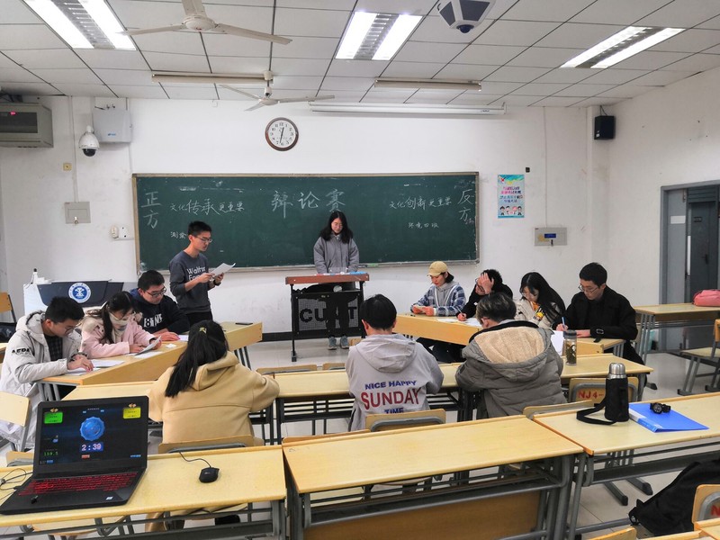 的辩论赛复赛阶段。此次辩论赛有幸邀请到辩论队往届队员担任评委。由测绘类19-6班班对阵环境类19-4班,测绘类19-10班班对阵环境类19-6班,他们通过辩题“文化传承和文化创新哪个重要”展开激烈辩论。