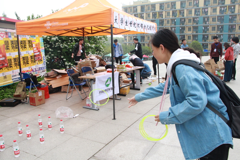 本次活动共分为五个环节,首先是“我换我换环保行动”。上午十点,同学们陆续来到二食堂广场设置好的废品兑换点,将所收集的塑料瓶和废弃纸箱交给工作人员以待回收。随后是”环保保龄球”活动。参与的同学用足球击倒摆放好的塑料瓶保龄球,达到相应数目即可领取小礼品。而在接下来的“环保套套环”活动中,参与游戏的同学们只要用套环套住塑料瓶,易拉罐、瓶盖所组成的阵地中的物体,达到一定积分后即可领取对应礼品。随后,同学们积极参与“亿绿校园,我想说”的环节,即在展板上用便利贴写下自己对减塑,节能等诸多环保方面想说的话或对环保事业所提的意见。最后的“亿绿留影”环节中。本次活动的参与同学简要说出自己对当今环保问题的见解,以及参加此次活动的感想,并在“我承诺”留影板后纪念留影。