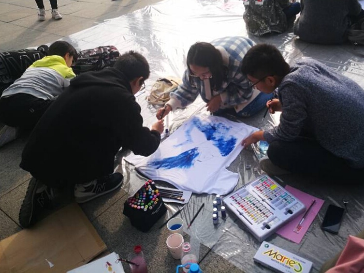 比赛开始后,各个参赛者便各尽所能,或握笔思索,或提笔创作,纷纷投入到了接下来紧张而又激烈的一个小时中。比赛期间,由社联美树密码的成员维持比赛秩序、提供相应的帮助。参赛选手利用五彩斑斓的颜料,将巧妙的构思与天马行空的创意,一一在T恤衫上自由发挥,创作出一幅幅风格多样的艺术画。整个比赛现场气氛热烈,吸引了众多老师和同学围观。上午10:30,比赛结束,所有参赛人员也都完成了自己的作品,并把自己的作品拍照提交,最终将通过微信投票平台决定选手的比赛成绩。在参赛人员各自留下自己的参赛作品后,此次比赛正式结束。