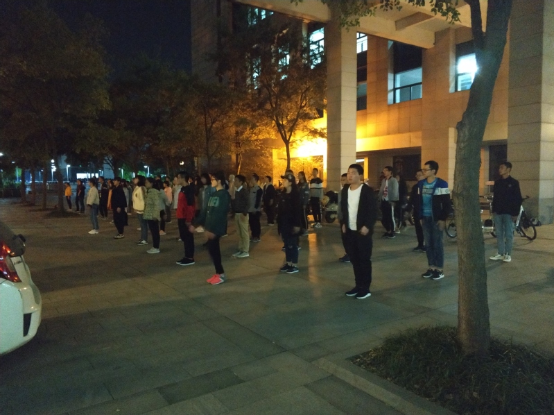 广播体操队全体成员在图书馆一旁空地上进行训练,此次训练旨在为即将到来的肉漫画