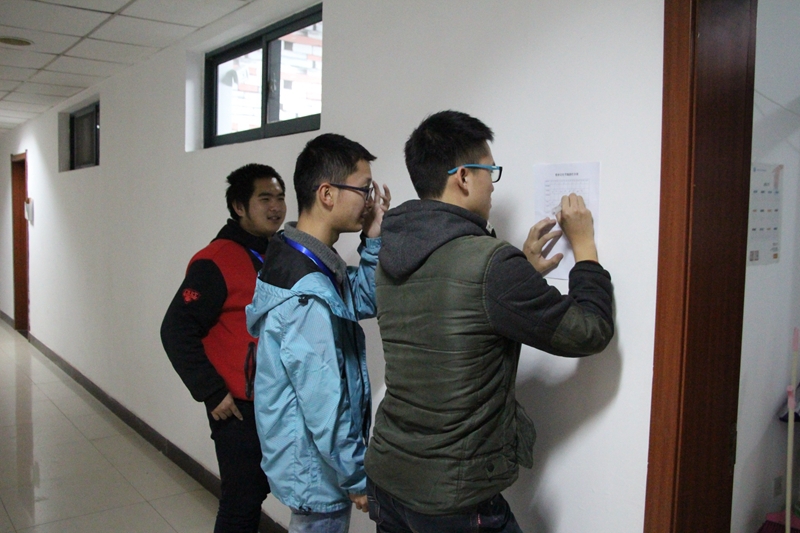 学生会生活部工作人员准时在桃苑5号楼下大厅集合,经过协商讨论后分组对各宿舍进行检查评分。