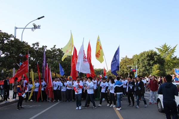 所有参赛队伍在起点集结完毕,负责人一声令下,所有人一齐开跑,向着终点进发。赛程之中,各院选手们在院旗之后尽力奔跑。大家团结一致,挥洒汗水,不落下一名队员,凝聚在一起。