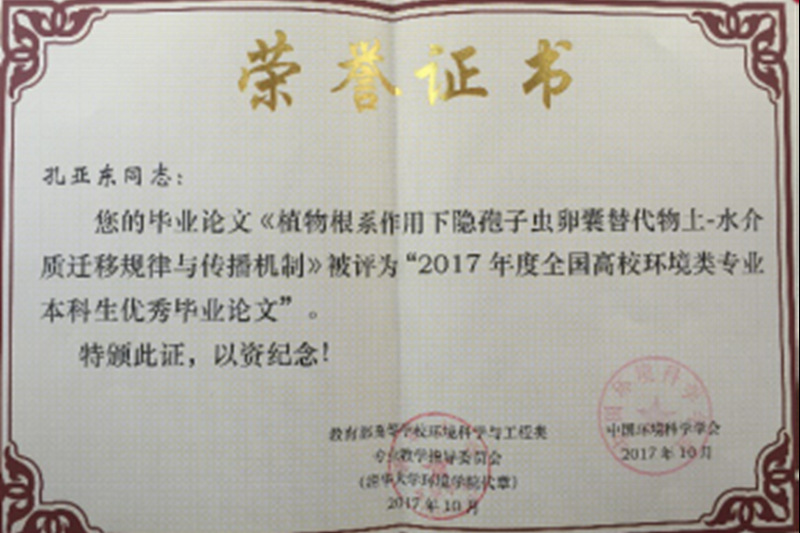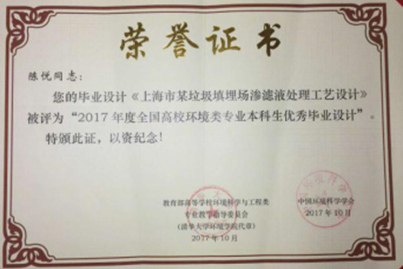 “全国高校环境类专业本科生优秀毕业设计(论文)奖”是由教育部高等学校环境科学与工程类专业教学指导委员会、中国环境科学学会主办,本次评选共有浙江大学、哈尔滨工业大学、肉漫画