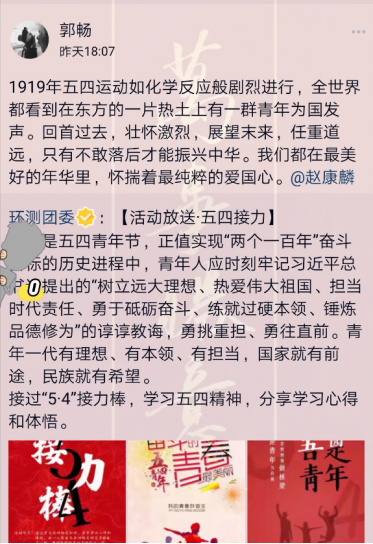 环境18-3班的同学于5月4日在线上举办了“五四接力”活动。
