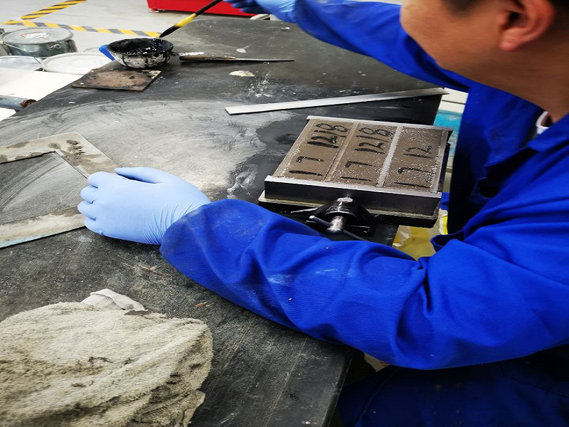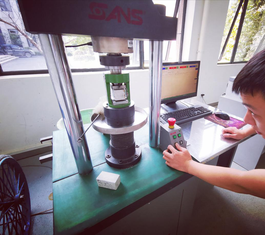 随后,在实验员的指导下,韦惠山参与了水泥成型及其强度检测的实验。这个实验是根据企业提供的原材料样品,为其探寻更高强度、更抗压的优质水泥。实验结束后,韦惠山与实验员通过数据对比,找到了实验中最高强度的水泥,为企业的水泥生产提供了数据参考。