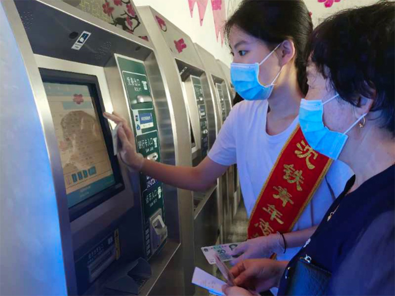 实践人员帮助旅客购票