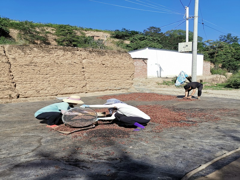 下午4时,实践人员回到农户家里,对刚刚采摘花椒进行去籽,以便更好的将花椒中的水分去除。实践人员通过筛子将花椒和花椒籽分离,它不仅需要很强的臂力,也需要丰富的经验。随后要将这些去籽花椒进行晾晒。农户告诉实践人员,可以通过观察,判断花椒何时晒干,这样花椒的成色会非常好。