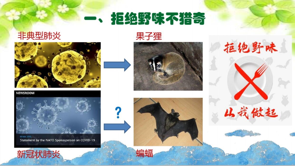 在实践过程中,郭祖晋就“什么是野生动物”,“为什么要保护野生动物”,“野生动物体内常见的,足以致命的病毒种类以及可能引发的相关病症”等问题和班级同学展开了讨论,结合网络信息和同学的个人观点得出了上述问题的答案,并结合PPT进行了相关的讲解。最后得出结论:野生动物保护已不仅是生态文明建设问题,更是维护公共安全的重要问题。面对疫情敲响的警钟,我们应该深刻反思我们的饮食文化观,摒弃生活中的饮食陋习,慎防“祸从口入”。