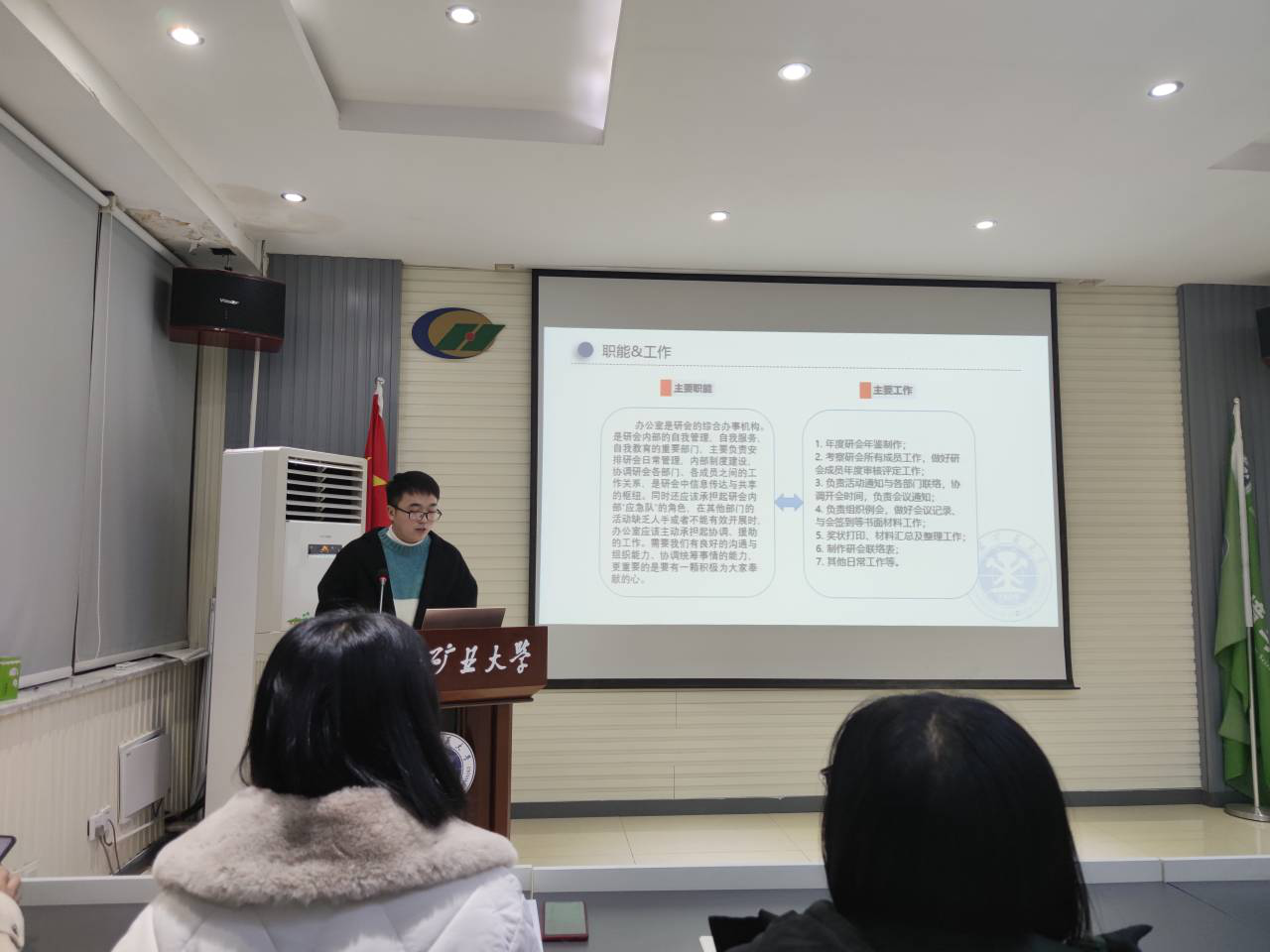接着是学术部部长李铭婉讲述学术部的情况,学术部举办了多次学术讲座,如国奖交流大会与公考经验分享会,并负责三次学术报告的考核工作,最后指出学术部接下来的工作重点是开展“声临其境”之英语配音征集活动与2020地球空间信息科学博士生论坛、肉漫画