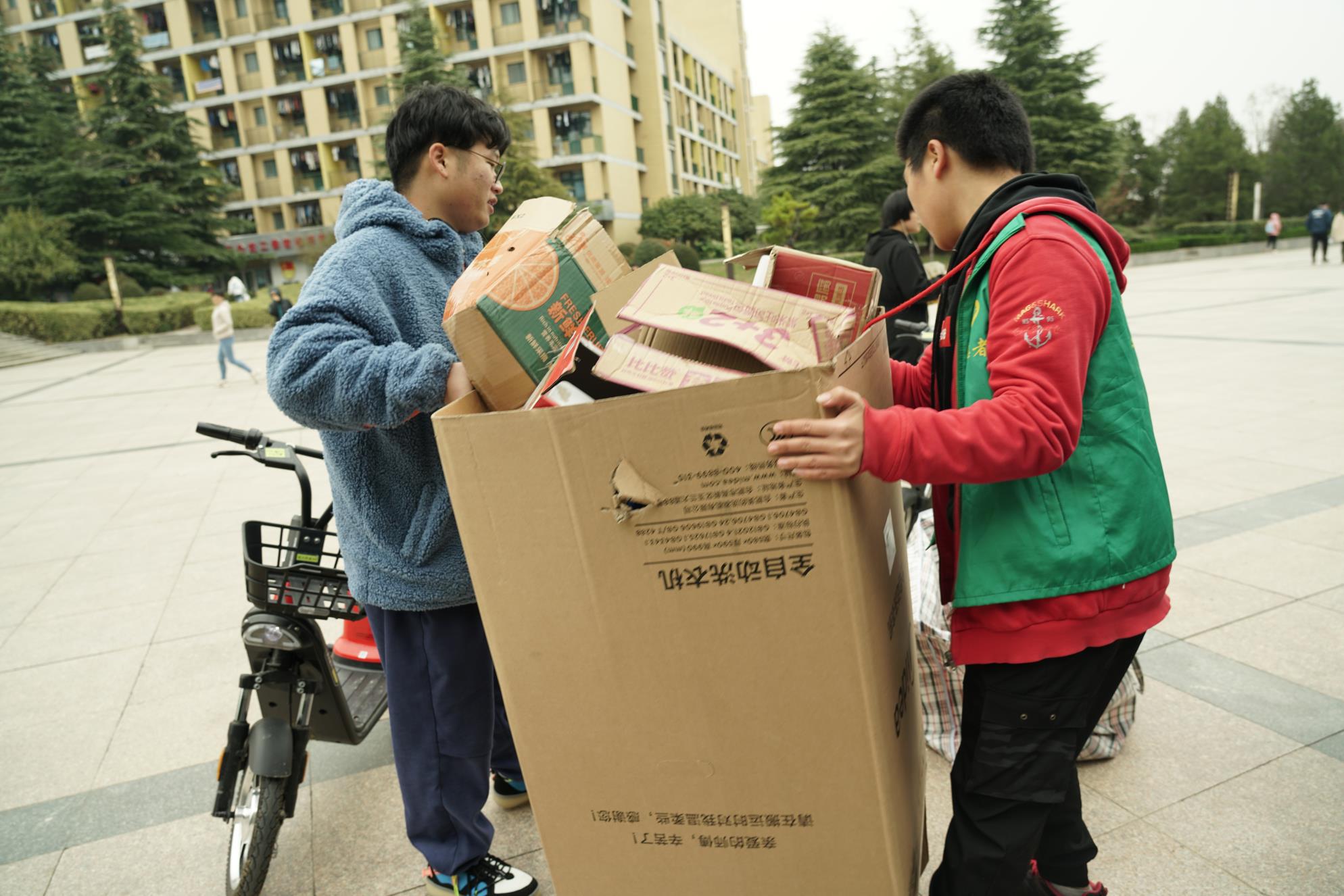 活动前夕,我校大学生世纪环保组织首先采取线上宣传模式,在公众号上推送环保知识,为大家耐心讲解关于纸盒循环的好处及其环保意义。随后,工作人员到各宿舍楼进行宣传、发放传单,张贴创意海报等线下宣传也在有条不紊地进行。活动现场,同学们积极参与,送来许多废弃纸箱,工作人员也在二食堂广场认真地把同学们捐赠过来的纸箱展开、放平、分类、堆放整齐。质量较好的纸箱留着循环利用,质量较差的纸箱压扁放平并进行“纸塑料分离”。有许多志愿者主动帮助工作人员整理纸箱,活动现场秩序井然。活动结束后,工作人员及时地把完整纸箱送往了学校菜鸟驿站处进行回收使用,其余破损纸箱则被集中送往了废物回收处。