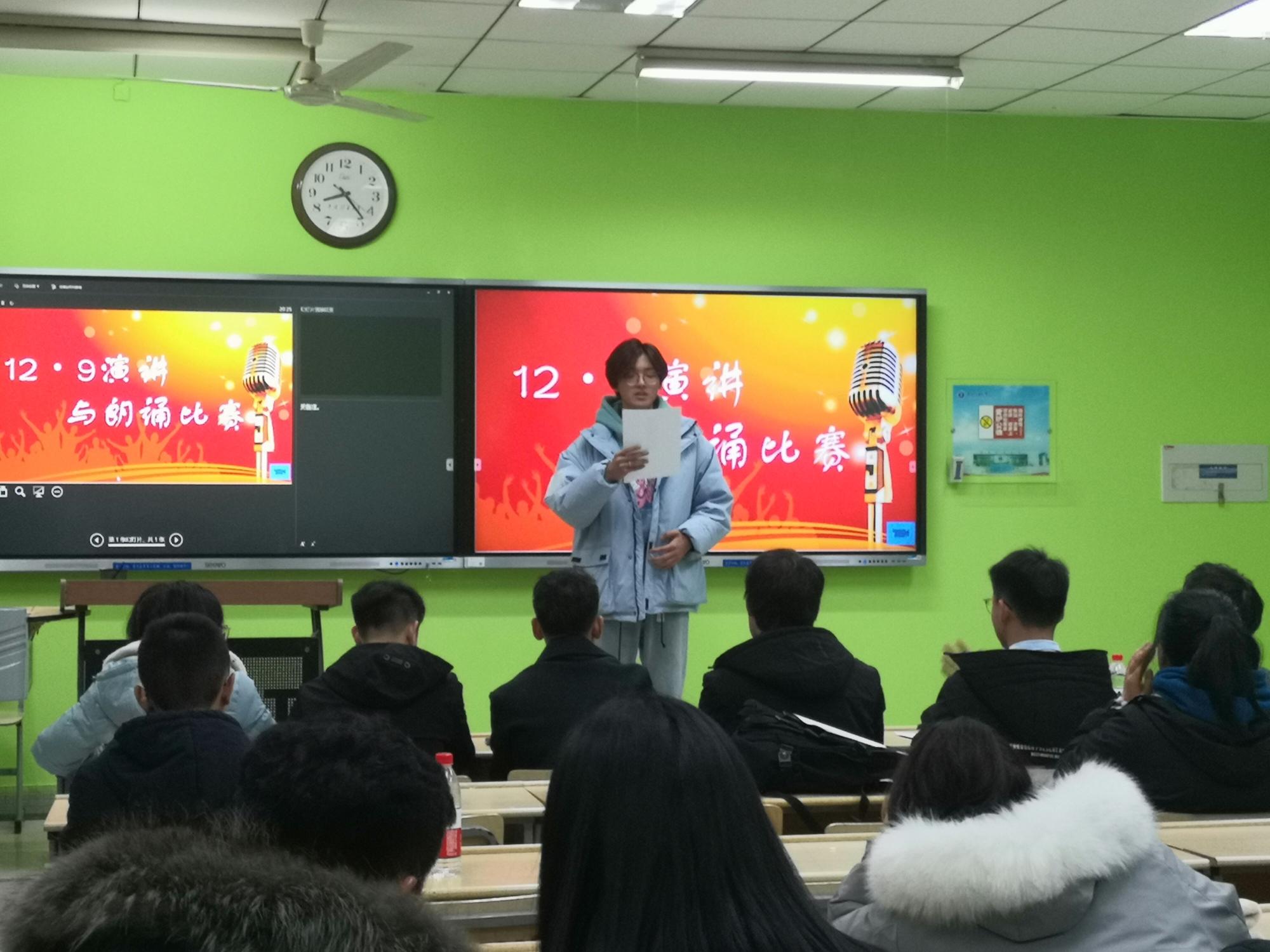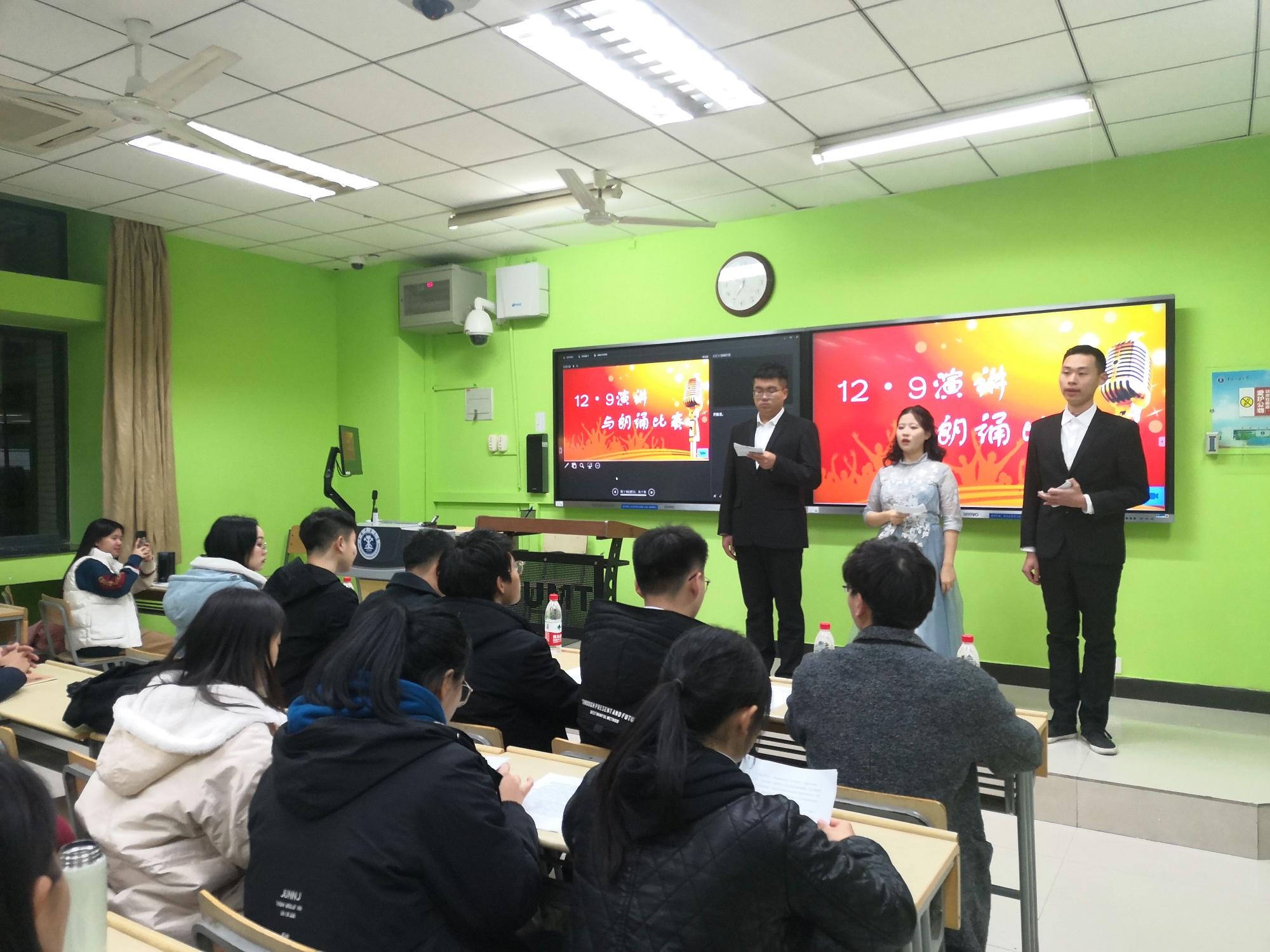 晚7点,活动正式开始。首先,由主持人致开场词,并介绍本次比赛主题的背景。本次比赛共分为主题演讲与即兴朗诵两个环节。参赛选手们通过抽签对拿到的诗歌进行即兴朗诵。现场,各位选手表现镇定从容,以饱满的激情,昂扬的精神状态给在场听众带来精彩的朗诵。将自己对一二·九运动的深刻认识和对伟大祖国的深深爱融化在朗诵里,感染着在场的每一位老师和同学。在精彩的演讲朗诵后,参赛选手共同观看了“一二九爱国教育”纪念短片,从而同学们对一二·九运动有了更深入的了解,也对自身的责任和使命有了进一步的认识。