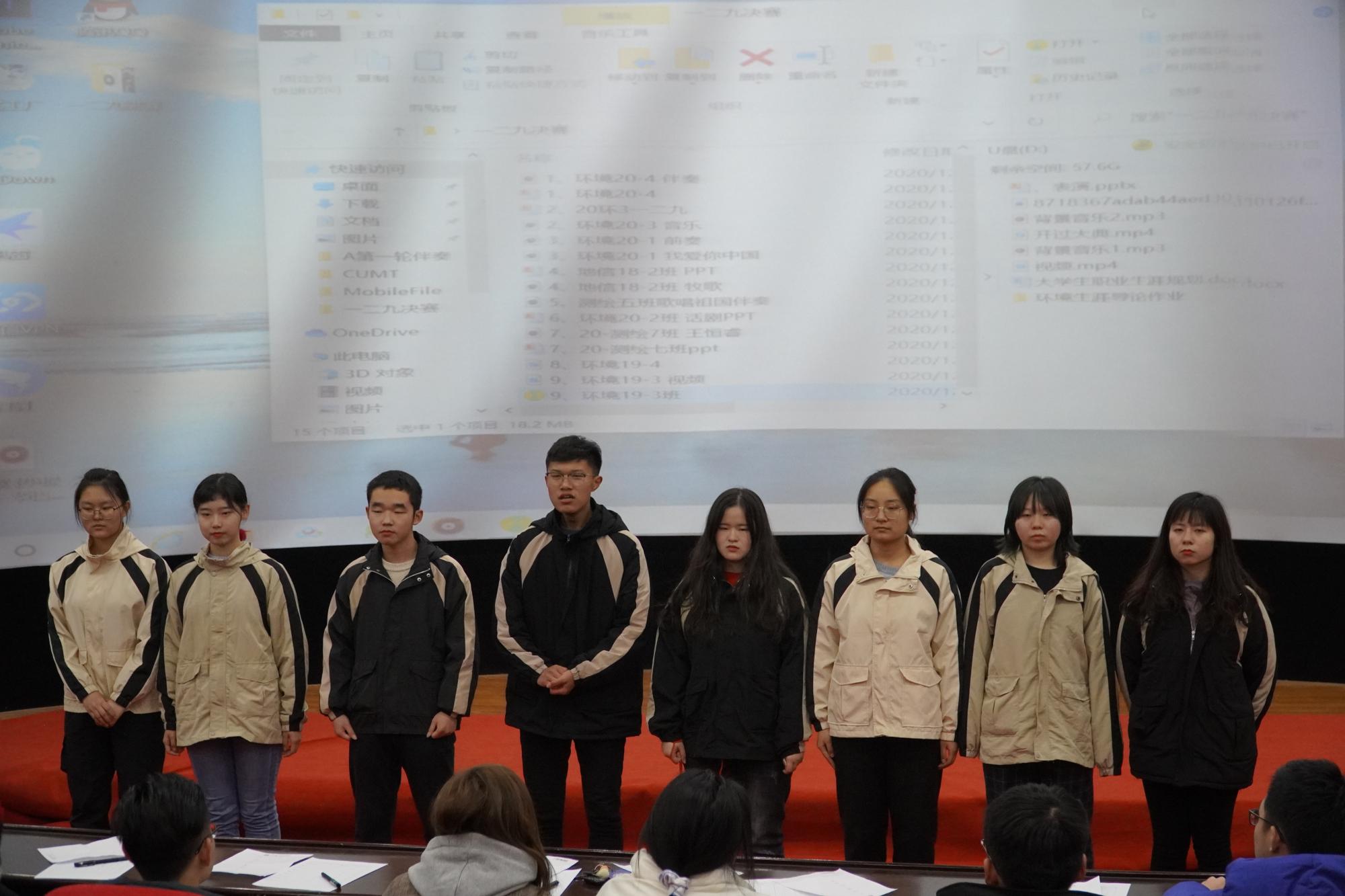 各班级的朗诵与表演穿插进行,以一种新颖的表演形式生动展现出同学们对“12.9”的理解,更展现出当代大学生的风采和深深的爱国之情。首先出场的是20级环境科学与工程4班。同学们身着统一着装,排好队列,在指挥员的带领下深情合唱一首《我和我的祖国》,表达出青年大学生深深的爱国情,展现出班级积极向上的精神风貌和团结一致的班级凝聚力。随后,有《我爱你中国》《歌唱祖国》等一系列节目,充分表达了同学们的爱国情感,现场活动氛围浓厚。最后,比赛在评委老师与各班级负责人合影留念中顺利结束。