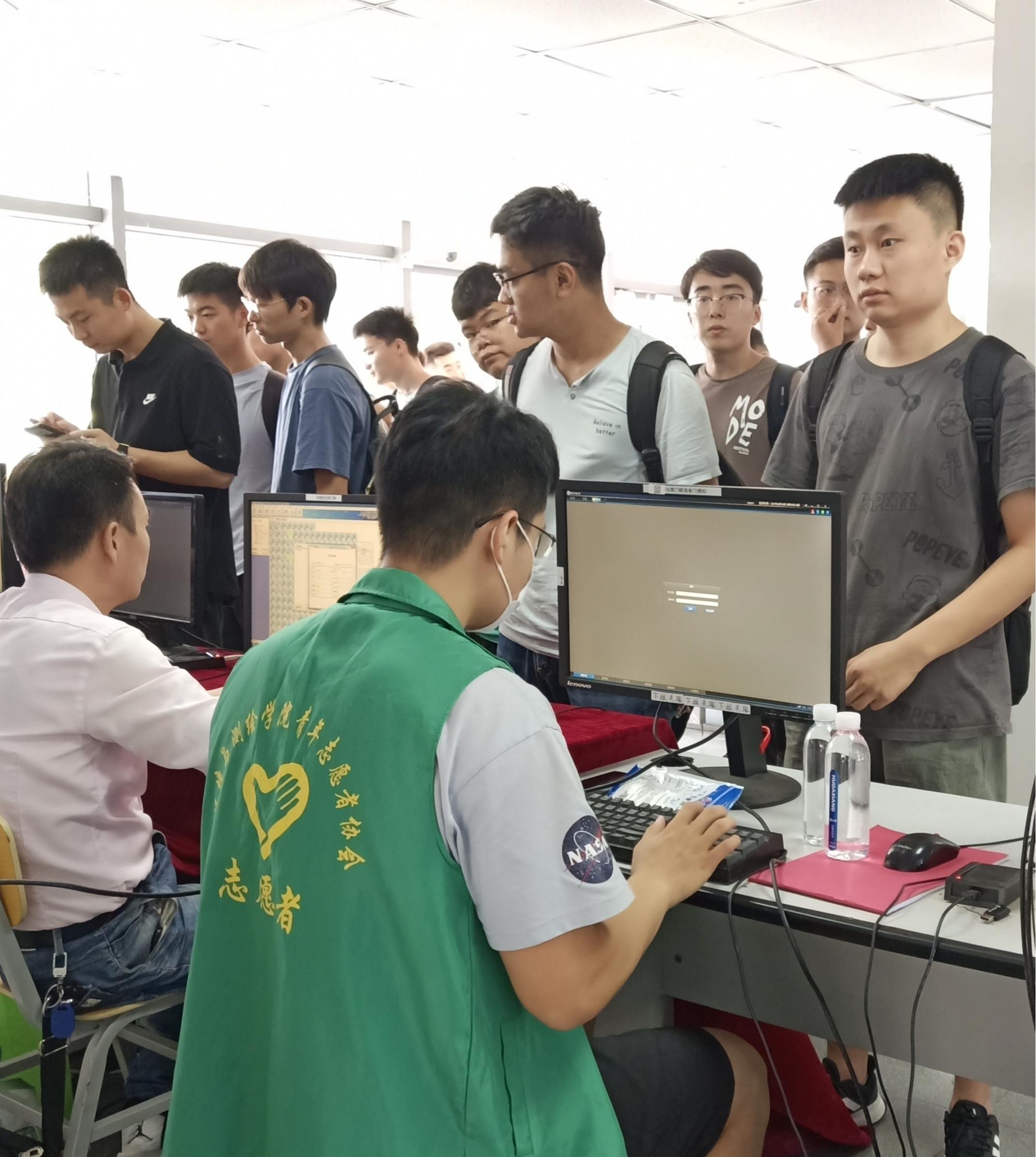 志愿者们身着绿色志愿者服装,不畏酷暑,斗志昂扬,穿梭在人群和楼道之中。志愿者们主要负责行李上下楼搬运、楼层引导、办理入住登记以及协助宿舍管理员维持现场秩序等工作,大家分工明确、各司其职,志愿工作顺利进行。