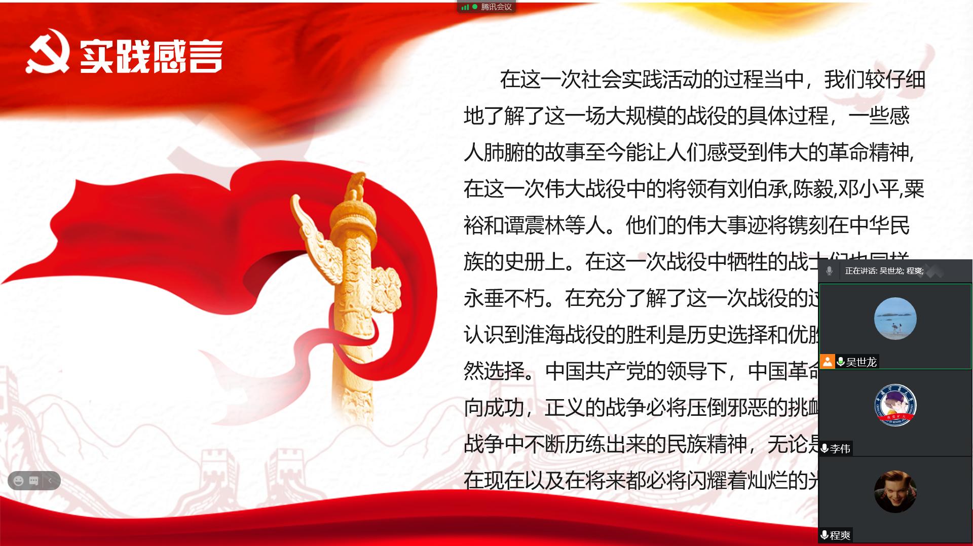 由于疫情影响,本次社会实践活动以“云会议”的形式展开。晚上9点,本次会议由吴世龙同学主持,并且从战争背景、战争过程、胜利原因、实践思考等四个方面开展了宣讲,讲述红色故事,传承红色精神。实践团成员认真观看着PPT演示,吴世龙同学声情并茂地向大家讲述淮海战役中感人至深的革命故事,把大家带到了战火纷飞的革命岁月,深切感受革命战争年代党和人民群众的血肉联系和全心全意为人民服务的优良传统。