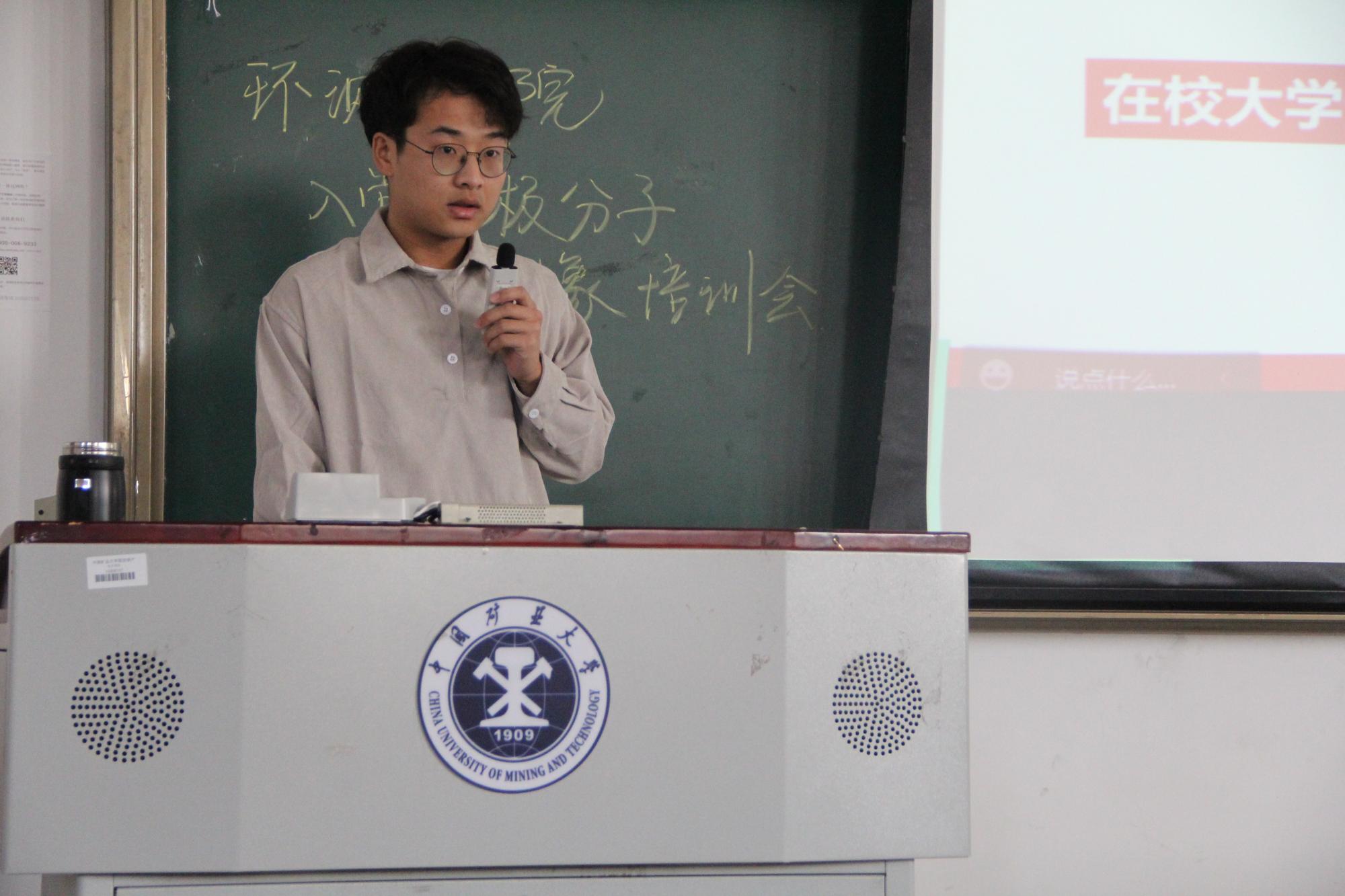 大会开始,蒋凯歌同学介绍了本期培训班的具体安排和培训要求,并要求各位同学认真履行职责,遵照党员发展流程,做好各项工作。会议中,蒋凯歌同学从入党的标准及条件、入党的培养和考察、党课纪律与考核要求、入党评分体系四个部分向同学们进行了详细介绍。并提出了几点要求:一是珍惜此次培训机会,提高思想认识,端正入党动机和学习态度,明确学习目的和任务,通过培训,进一步提高政治理论水平;二是时刻以一名优秀党员的标准严格要求自己,不断锤炼党性,提升自我,努力做到在思想上入党、在行动上入党、争取早日成为一名合格的共产党员。