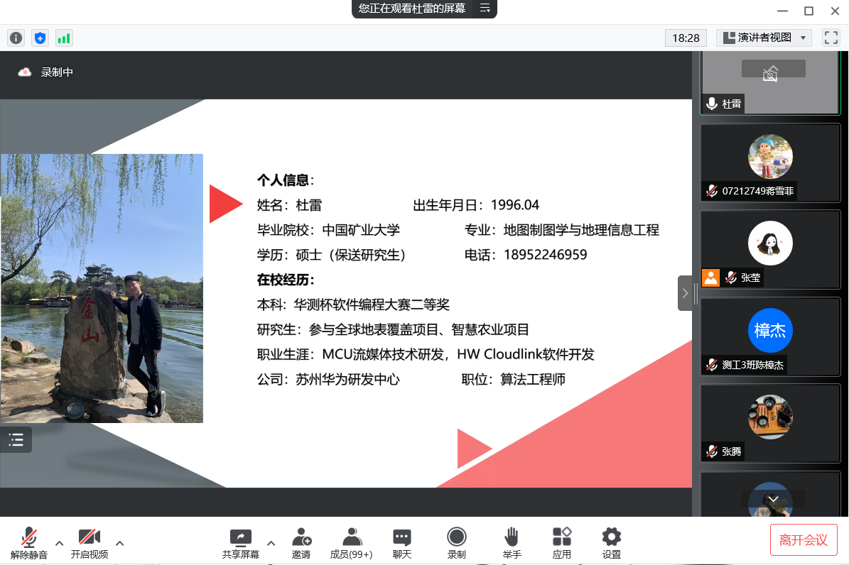 2012届测绘工程专业校友张馨方、2013届环境工程专业校友梅剑、2018届地理信息科学专业校友杜雷、2018届测绘工程专业校友张顺昕主讲,院党委副书记韩福顺、团委书记杨琪琪、2020级辅导员张莹及200余名学生参加活动。