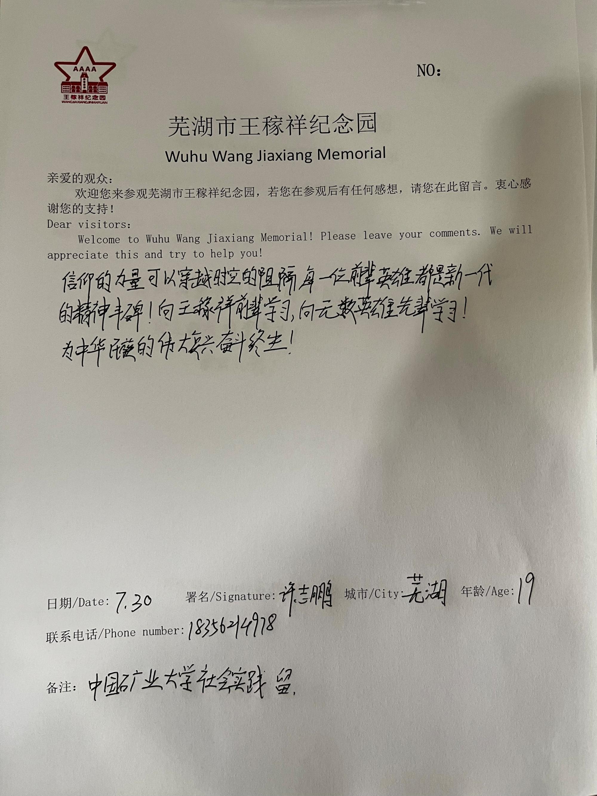 学子许志鹏赴芜湖参与“追寻红色记忆,传承红色精神”红色寻访活动。