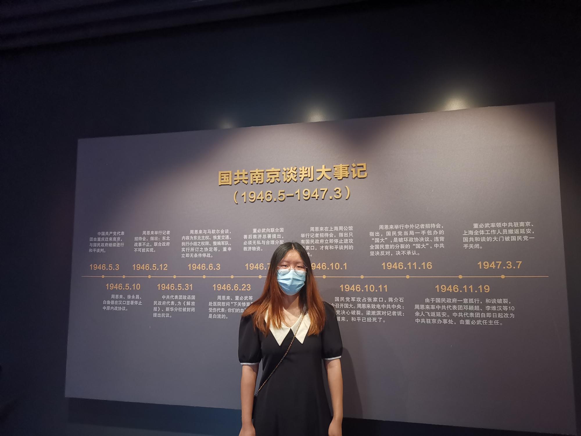 8月15日,队员朱倩同学前往江苏省南京市中共代表团梅园新村纪念馆。纪念馆由中共代表团办事处旧址、国共南京谈判史料陈列馆、周恩来铜像、周恩来图书馆等组成。1946年5月至1947年3月,以周恩来为首的中共代表团与国民党政府在梅园新村纪念馆进行了长达10个月的谈判,为全国解放奠定了基础。
