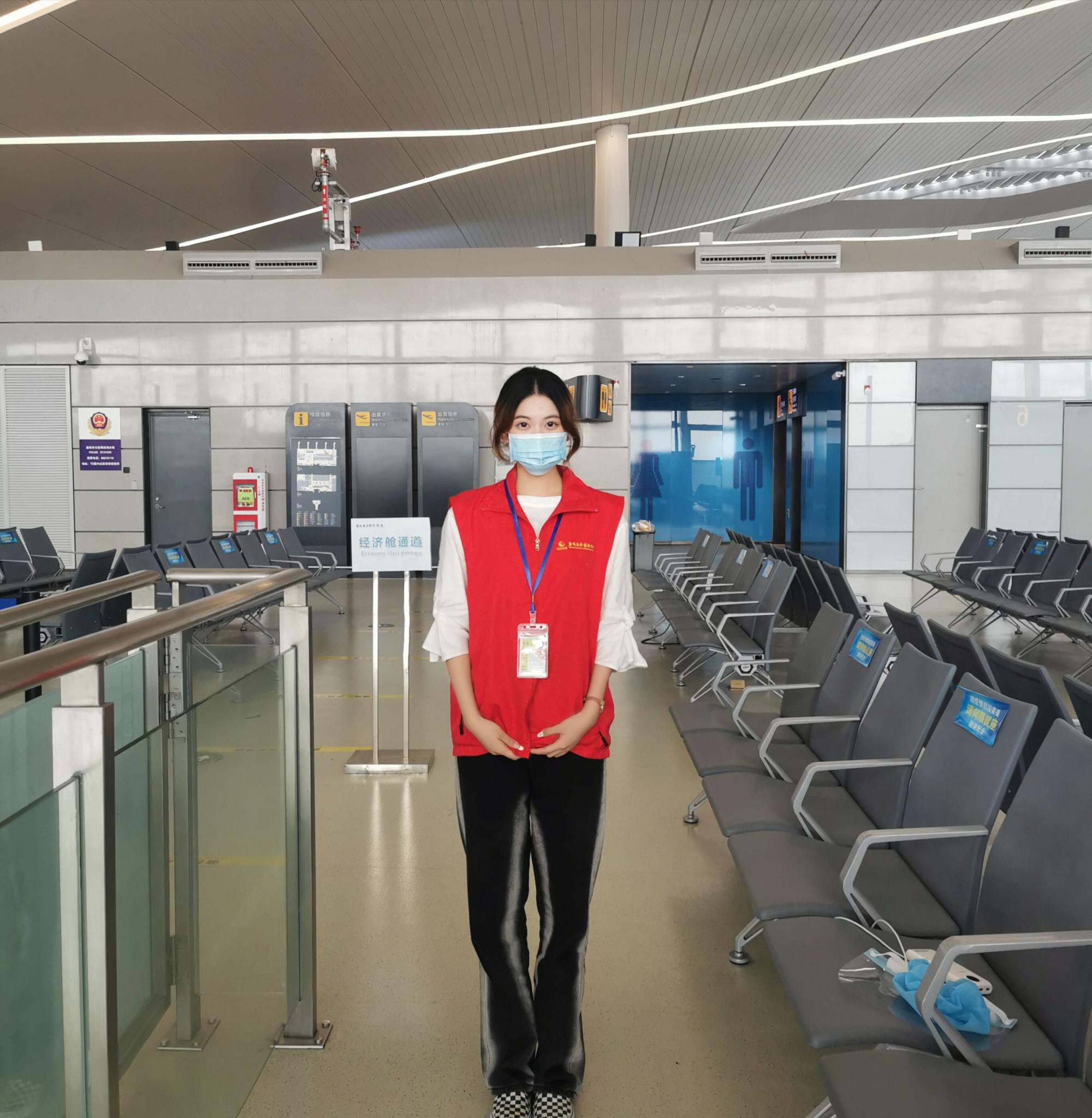王云帆同学每天早上八点半之前就要身着防疫服装到达工作岗位,每天值班6小时以上,并且进行的工作也十分多样化,分别为:协调乘客排队并保持一米距离、维持机场秩序、提醒乘客佩戴口罩、悉心解答乘客的疑问、在飞机延误时安抚乘客情绪、查询登机人员健康码、为乘客进行手部消毒等。乘客中也不乏老年人、外国人和一些行动不便的残障人士,这些对于志愿者个人能力是很大的挑战,但王云帆同学勇于克服困难,将本次志愿活动圆满完成。