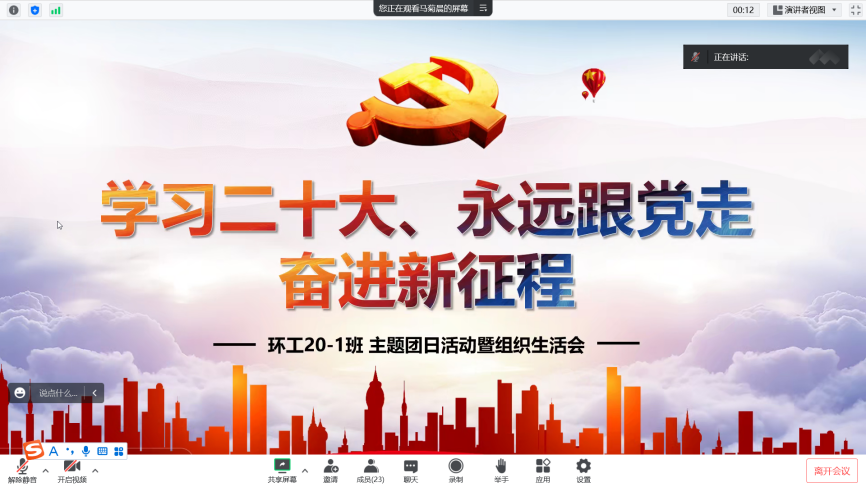 为深入学习党的二十大精神,12月13日晚7:20,环境工程20-1班于线上举办“学习二十大、永远跟党走、奋进新征程”主题团日活动暨组织生活会。