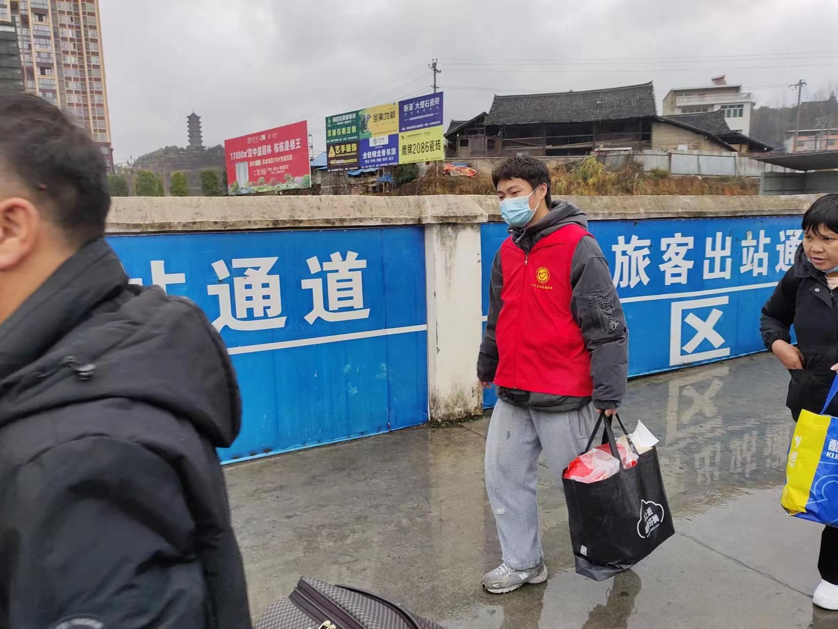 作为“乙类乙管”后迎来的第一个春运,返乡客流明显增多,青年志愿者需要早早来到车站为返乡旅客提供便民服务。活动中,志愿者们以“春运服务保障、防疫安全宣传”为主要内容,分批有序地开展志愿服务,分别在车站进出站口、售票厅、候车厅等处为旅客们提供引导咨询、秩序维护、提拿行李、应急救援等服务,同时进行防疫宣传,提醒旅客佩戴口罩等一系列有深度、有温度的志愿服务活动。罗朝龙同学作为提拿行李小组中的一员,积极地投入到工作当中去,为营造欢乐祥和、健康安全的新春佳节氛围贡献一份青春力量。