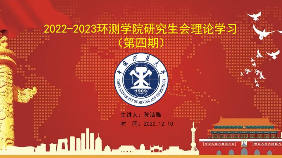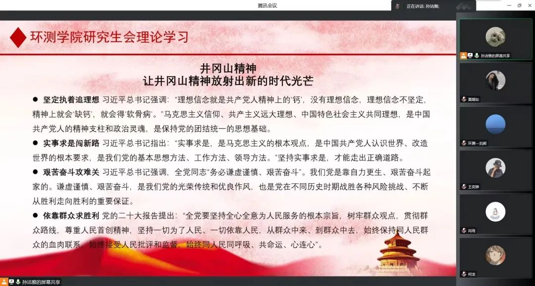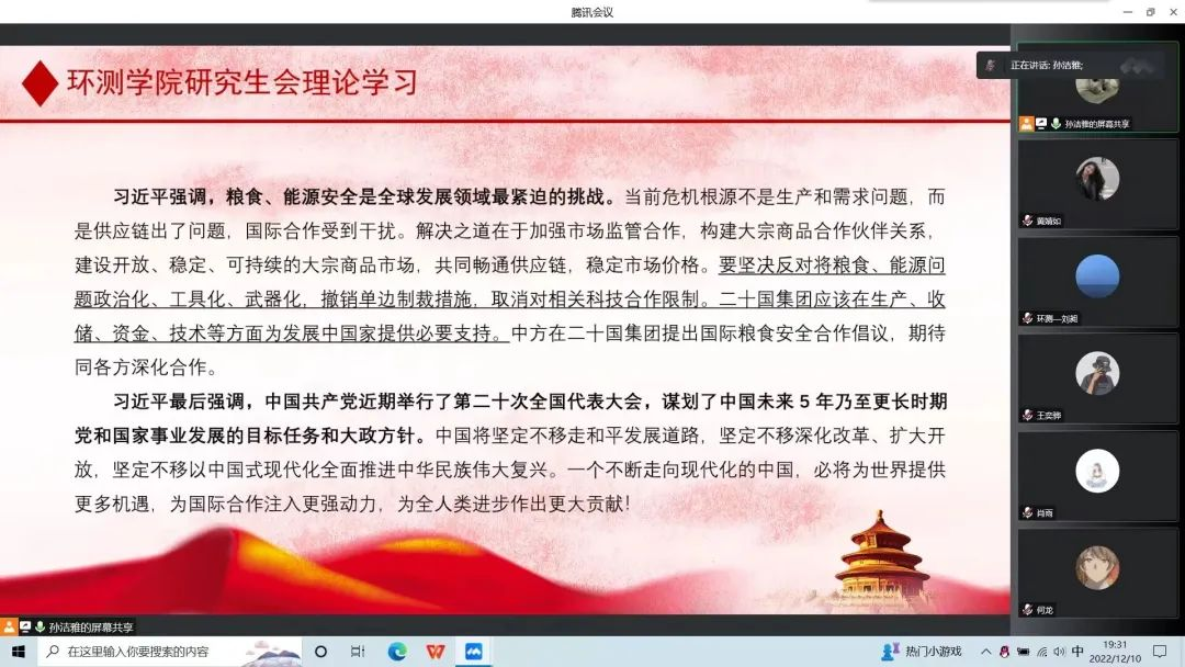 研究生会于腾讯会议举行了2022-2023年度第四期理论知识学习活动。本次理论学习由孙洁雅同学主持,共分为对习总书记系列重要讲话的学习、时政速递、中国共产党人精神谱系专题以及时政热评四个环节,整个理论学习在主讲人孙洁雅的组织下顺利开展。