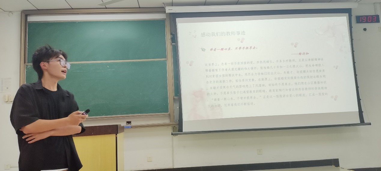 此次活动由团支书武佳瑢以及组织委员杨吉塞制作PPT以及完成组织工作,班长李自信进行主持,宣传委员冯梓敏进行现场活动的拍摄以及完成后续的宣传工作。活动的开始,班长李自信介绍了教师节的由来。第二部分,李自信同学为我们介绍了许多师生故事,以及关于感谢师恩的故事和名人名言。之后,李自信同学给大家观看了张桂梅的视频与哔哩哔哩联合各位教师拍的教师节影片来让大家进一步感受到老师对我们的一片冰心。最后,在主持人李自信对本次活动作出小结后本次团日活动正式结束。
