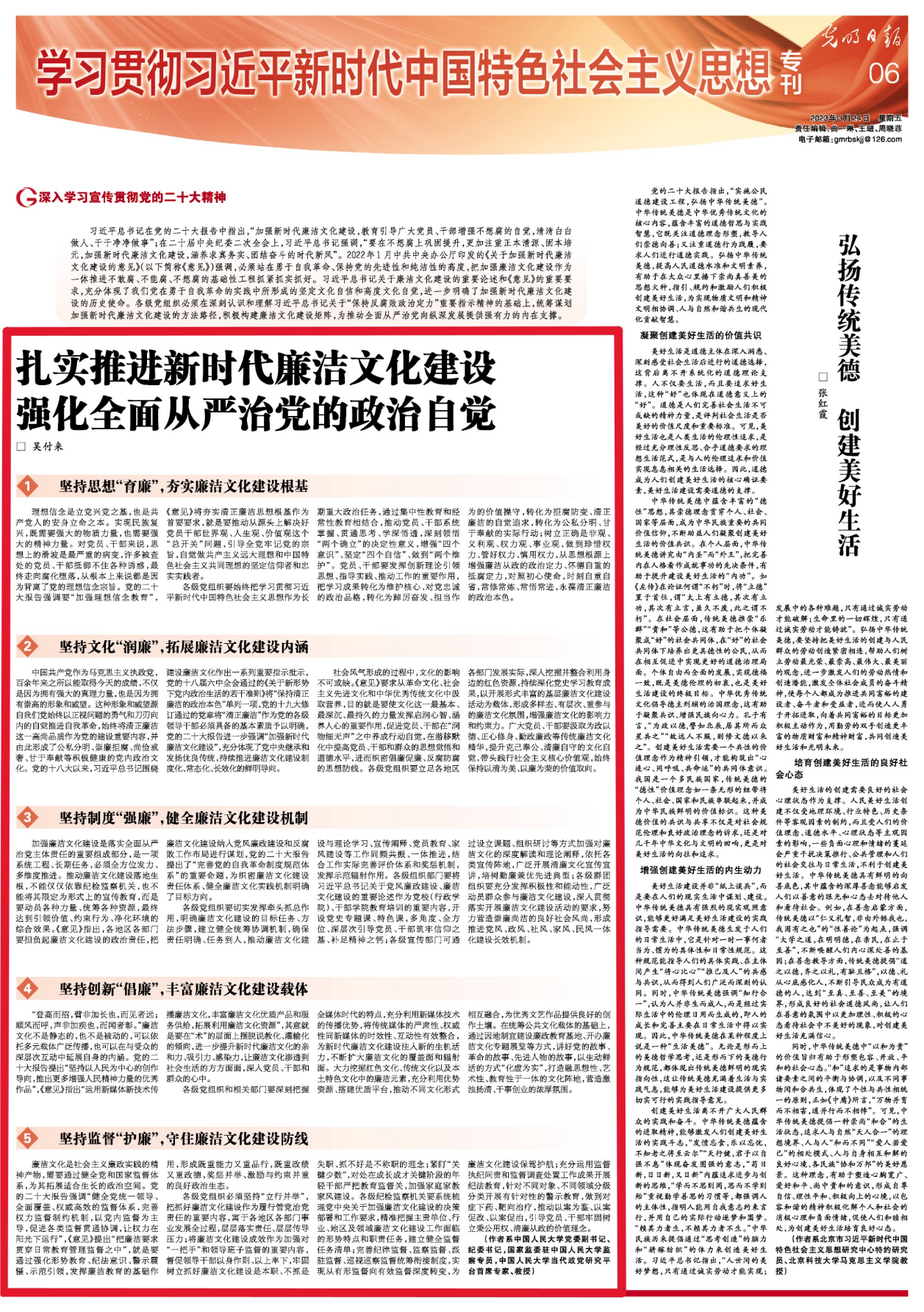 中国共产党作为马克思主义执政党,百余年来之所以能取得今天的成绩,不仅是因为拥有强大的真理力量,也是因为拥有崇高的形象和威望。这种形象和威望源自我们党始终以正视问题的勇气和刀刃向内的自觉推进自我革命,始终将清正廉洁这一高尚品质作为党的建设重要内容,并由此形成了公私分明、崇廉拒腐、尚俭戒奢、甘于奉献等积极健康的党内政治文化。党的十八大以来,习近平总书记围绕建设廉洁文化作出一系列重要指示批示,党的十八届六中全会通过的《关于新形势下党内政治生活的若干准则》将“保持清正廉洁的政治本色”单列一项,党的十九大修订通过的党章将“清正廉洁”作为党的各级领导干部必须具备的基本素质予以明确,党的二十大报告进一步强调“加强新时代廉洁文化建设”,充分体现了党中央继承和发扬优良传统,持续推进廉洁文化建设制度化、常态化、长效化的鲜明导向。