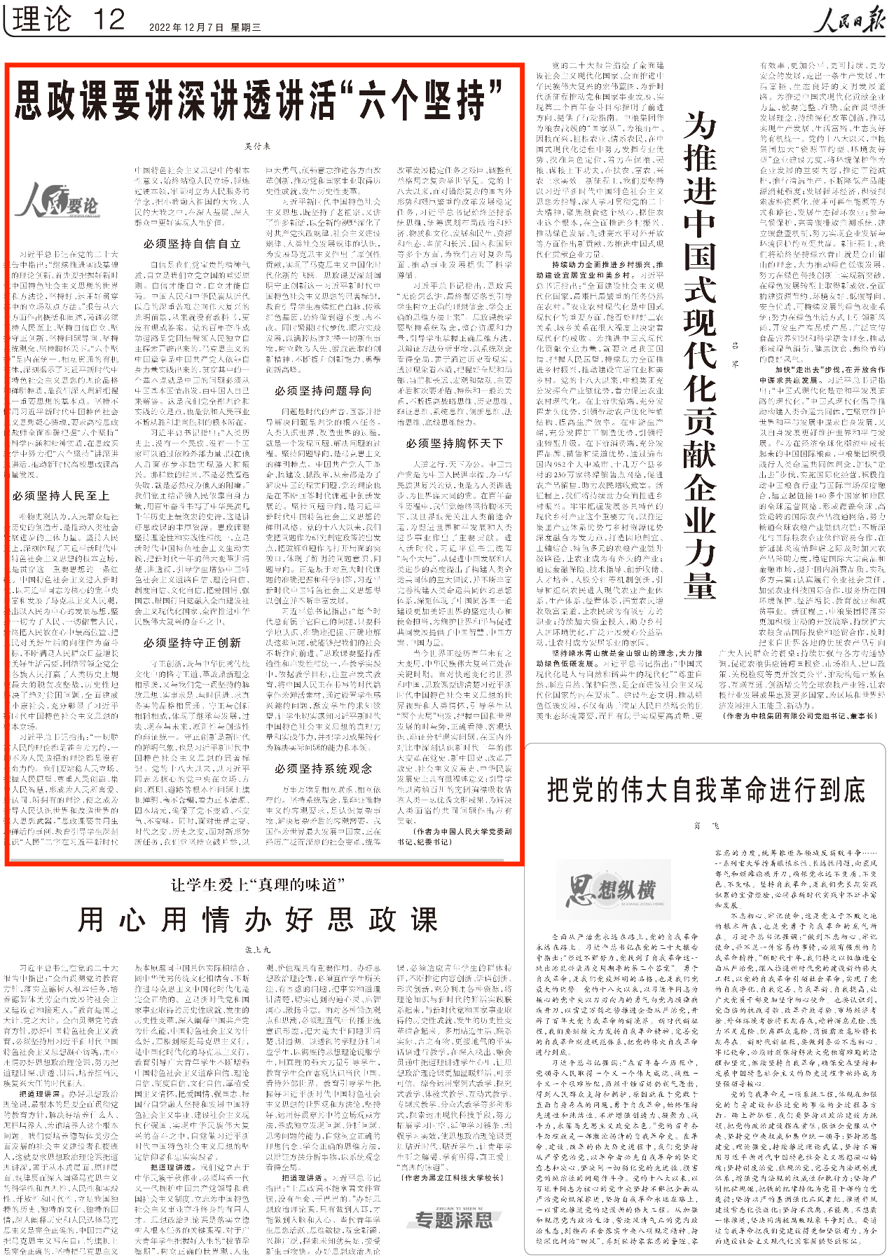 习近平总书记在党的二十大报告中指出:“继续推进实践基础上的理论创新,首先要把握好新时代中国特色社会主义思想的世界观和方法论,坚持好、运用好贯穿其中的立场观点方法。”报告从六个方面作出概括和阐述,强调必须坚持人民至上、坚持自信自立、坚持守正创新、坚持问题导向、坚持系统观念、坚持胸怀天下。“六个坚持”是内在统一、相互贯通的有机整体,深刻揭示了习近平新时代中国特色社会主义思想的理论品格和鲜明特质,是我们深入理解把握这一重要思想的基本点。坚持不懈用习近平新时代中国特色社会主义思想凝心铸魂,要求高校思政课教师全面准确把握“六个坚持”的科学内涵和精神实质,在思政课教学中努力把“六个坚持”讲深讲透讲活,推动新时代高校思政课高质量发展。